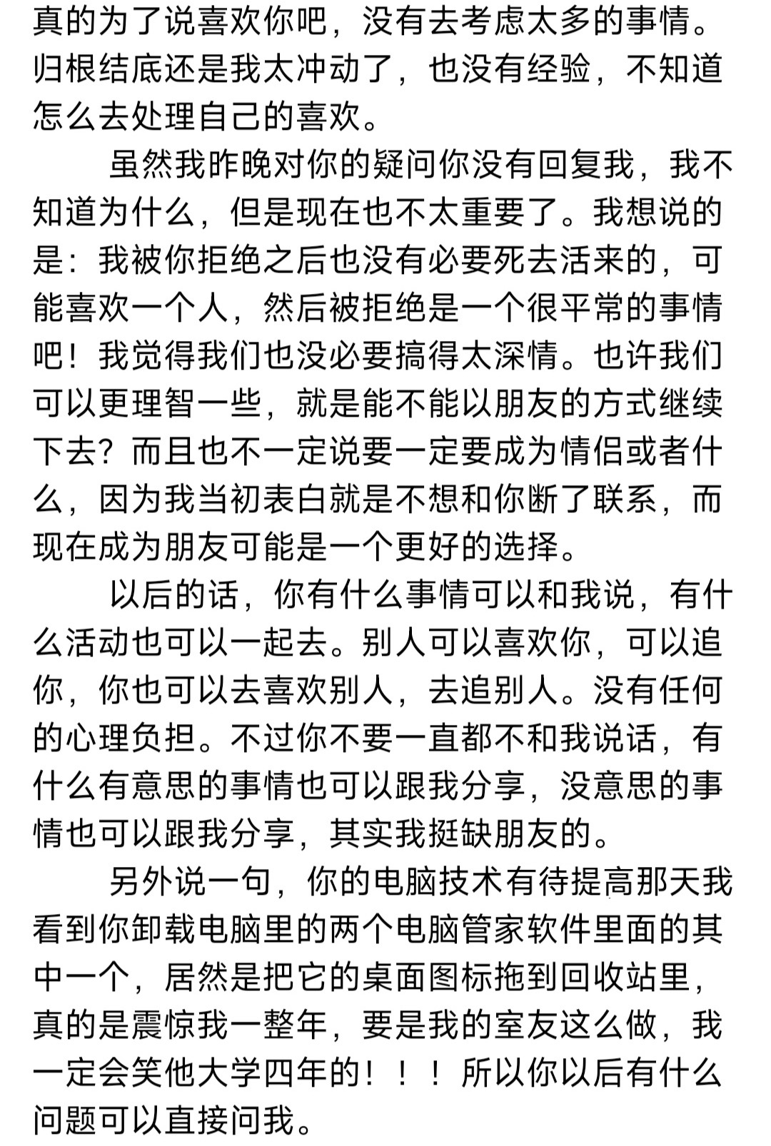第二天,我忍不住在微信上找了她的朋友Mei,说了很多很多,一个字一个字地打出来发过去。打字的过程也就将整件事理顺了很多,当我把一切都向Mei倾诉之后,心里已经好受很多了。我告诉自己她并没有自己想象中的那么完美,自己也并没有想象中的那么非她不可。我唯一不能接受的是自己第一次喜欢一个女生,竟会是这样的结果!喜欢一个人为什么会这么难受呢?喜欢不应该是快乐的吗?