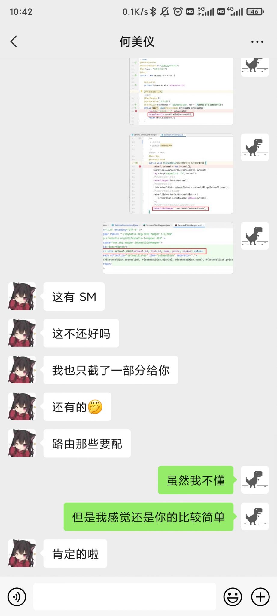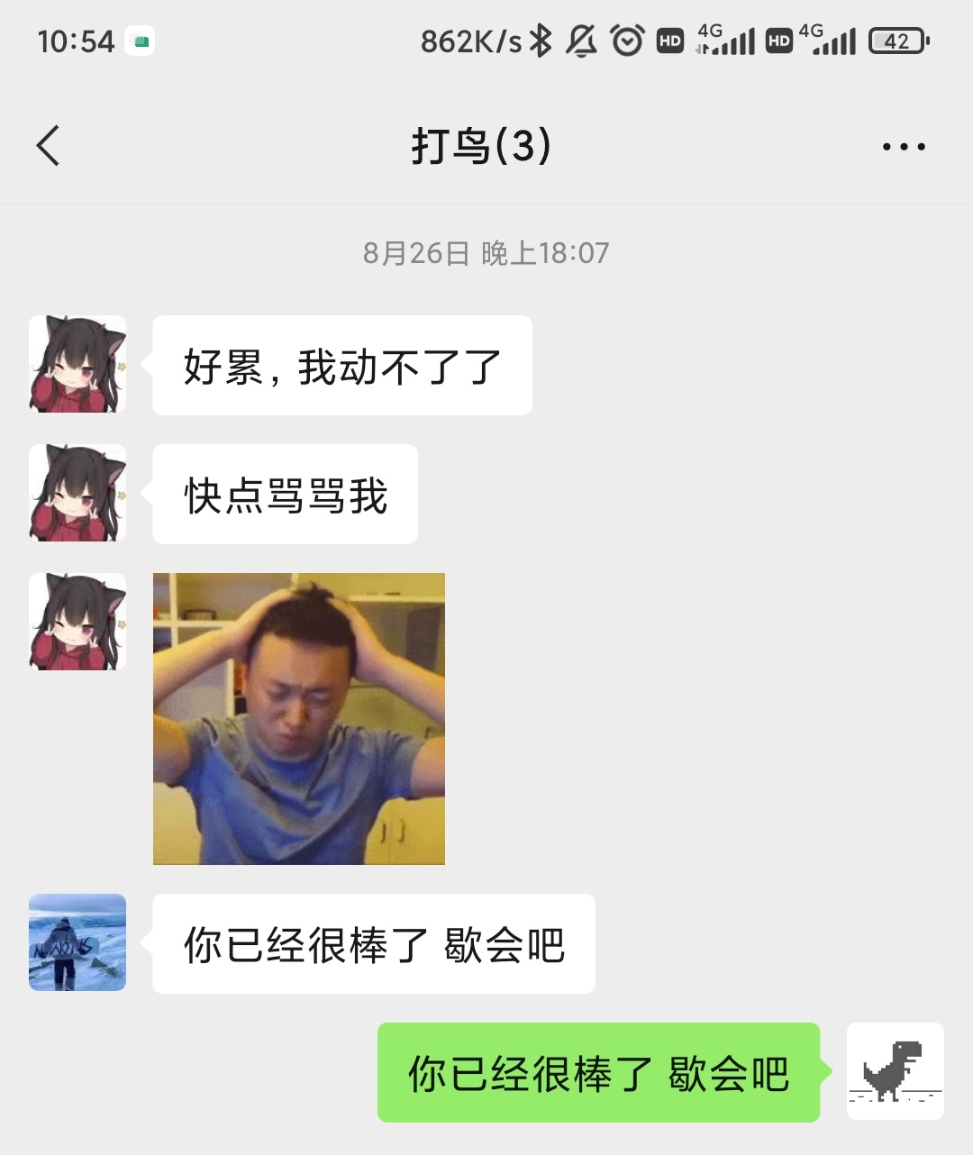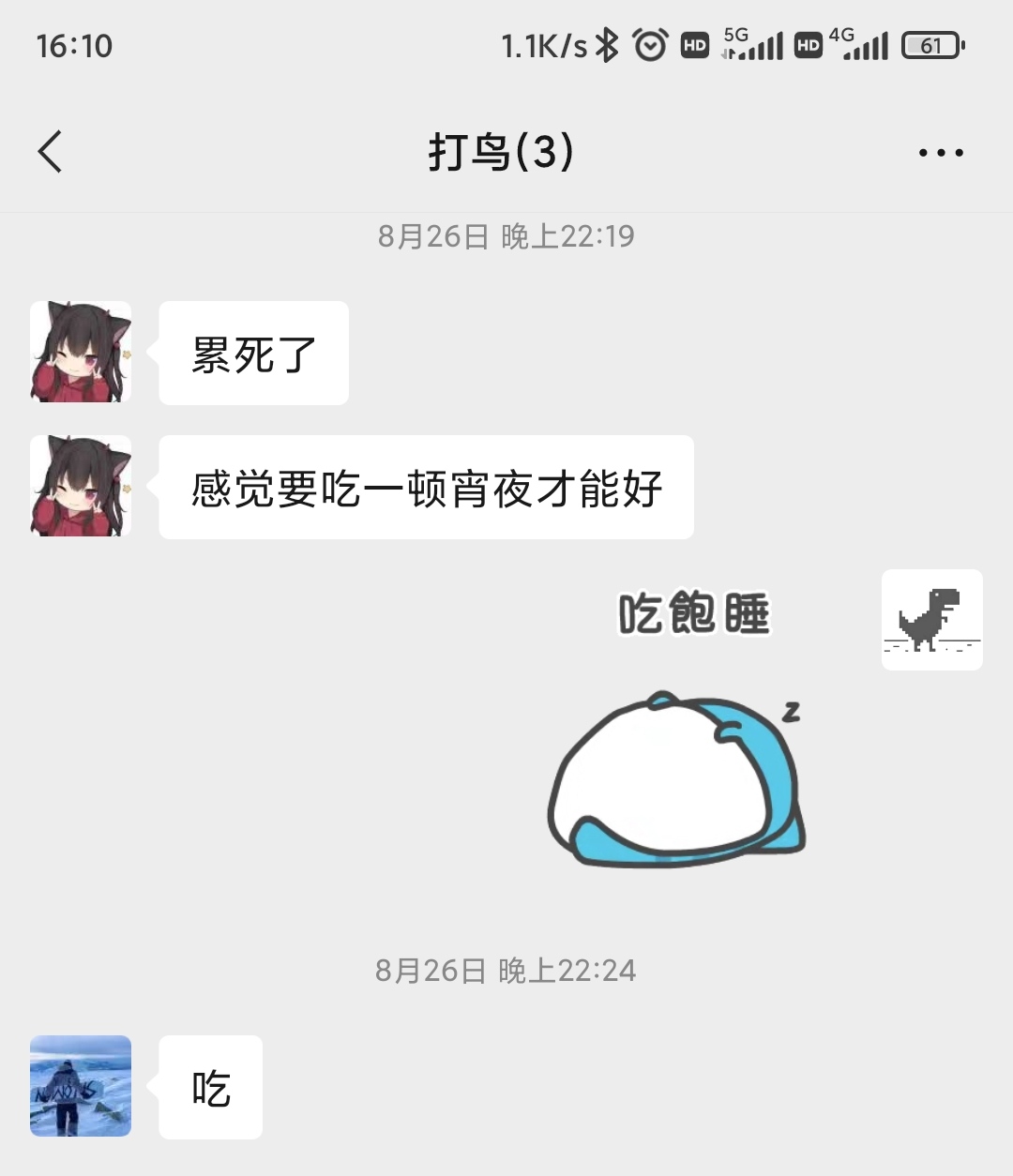 22:19,她又在三人群里发信息了:“累死了,感觉要吃一顿宵夜才能好。”我在心里说:“你不是在减肥吗,周四说好的拼单葡挞就是以要减肥为理由推掉的,你忘了?怎么现在就想吃宵夜了?“我虽然在心里是这样想的,但是我不可能这样说,只会了她一个表情包,过了一会,DLY发了一个:“吃”。