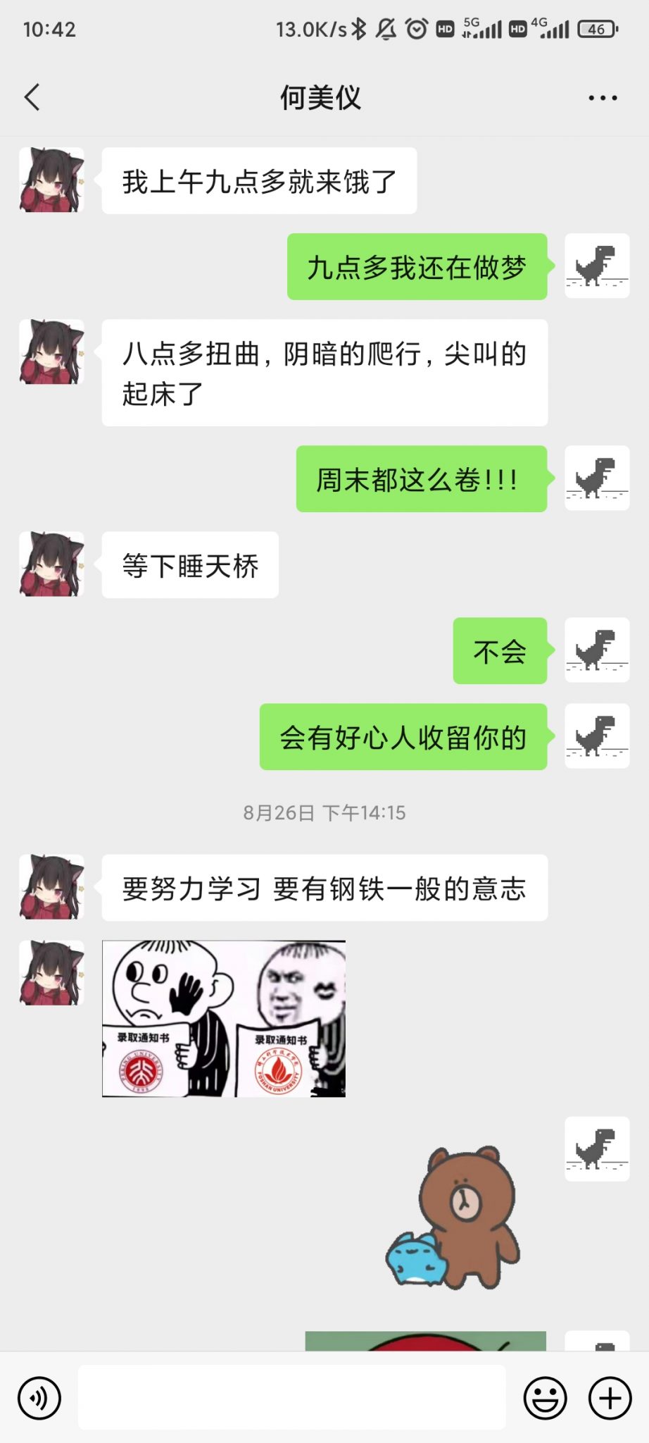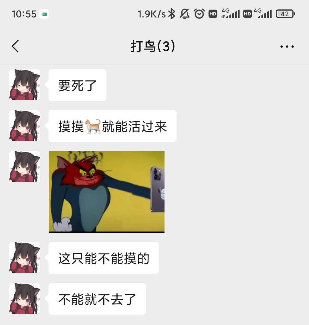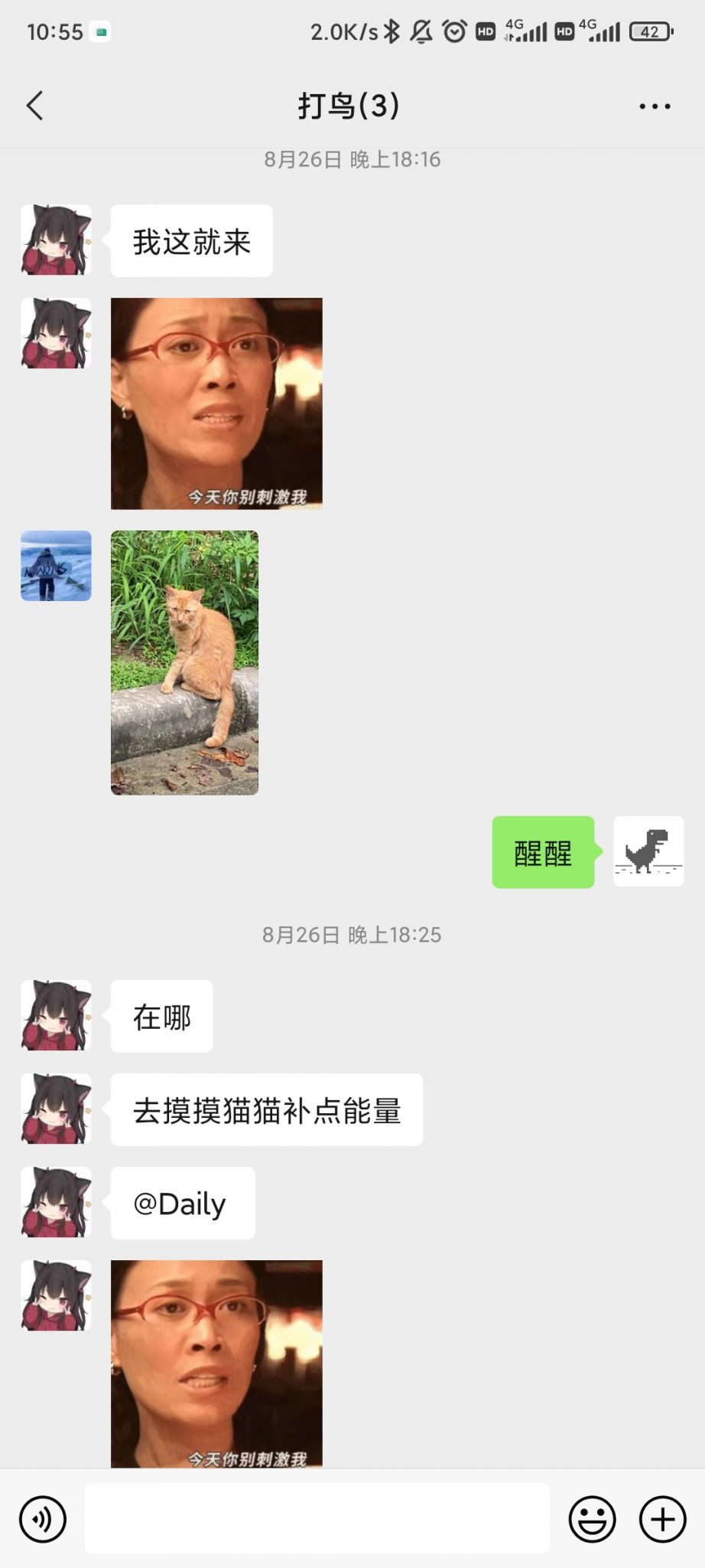 18:27 刚才她在群里发信息说:我这就来。我以为她马上就要过来自习室了。但是我等了好久都没有等到他。后来DLY发了一张猫的照片,她很感兴趣,直接@DLY问猫在哪,她要去摸猫补充点能量。其实她要去哪里要干什么和我一点关系都没有,我的关心我的在乎都是徒劳的没有意义的,因为她一点也不在乎我。