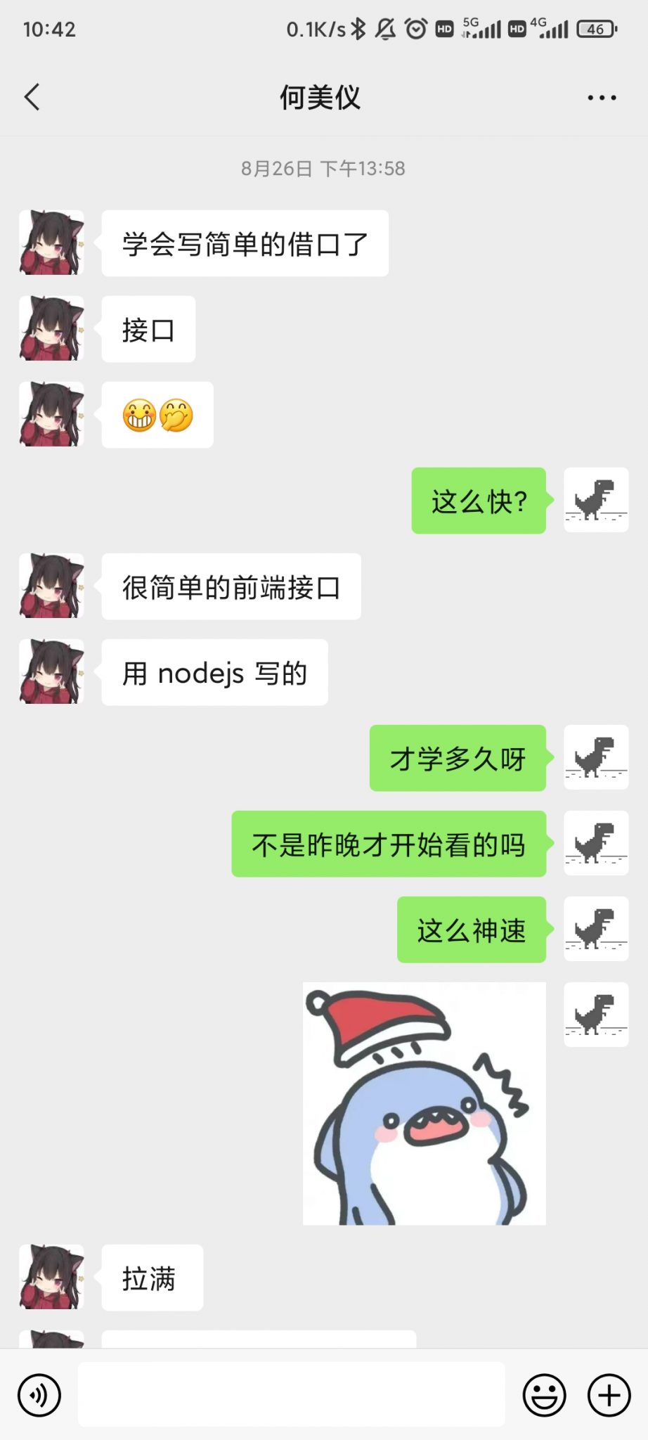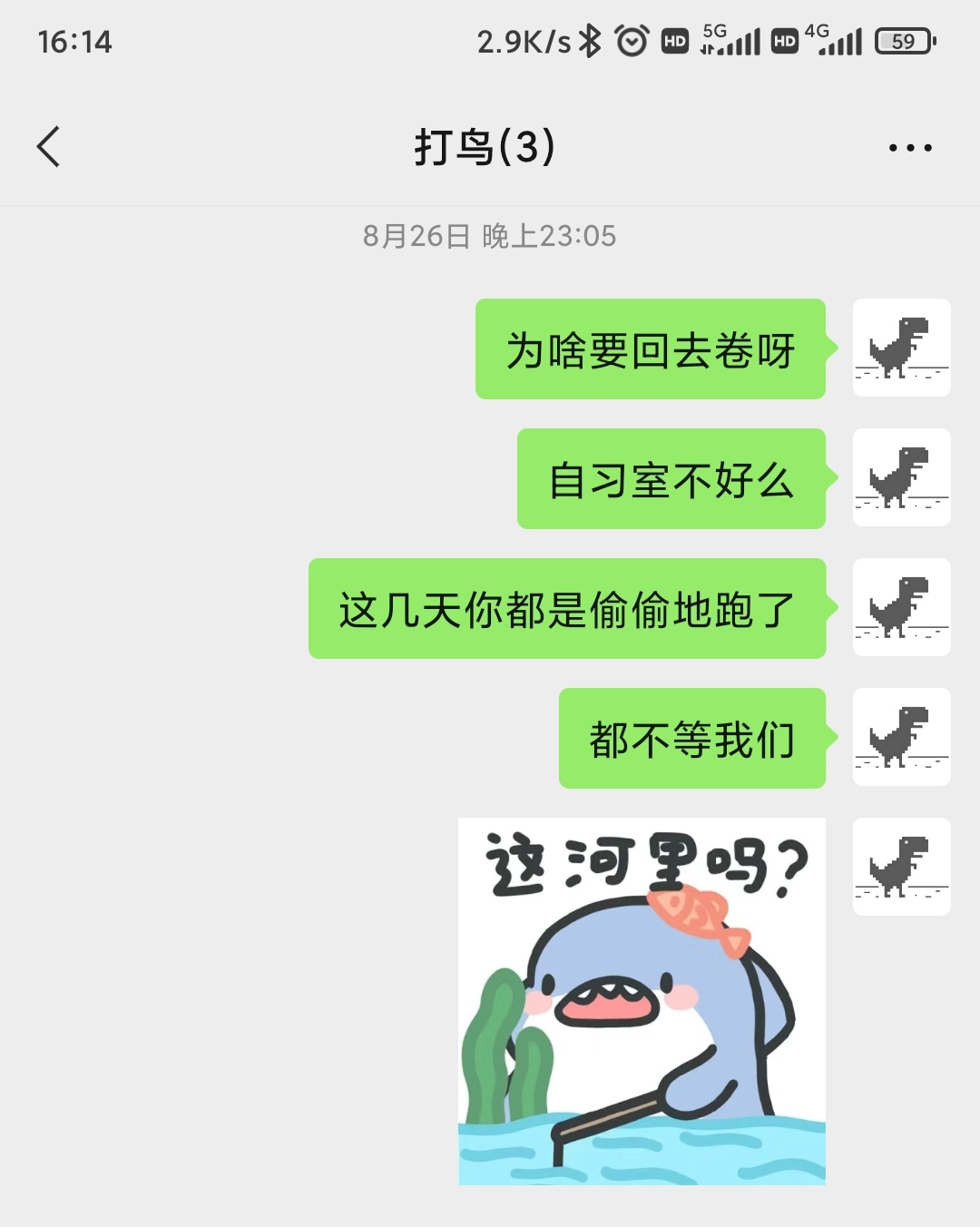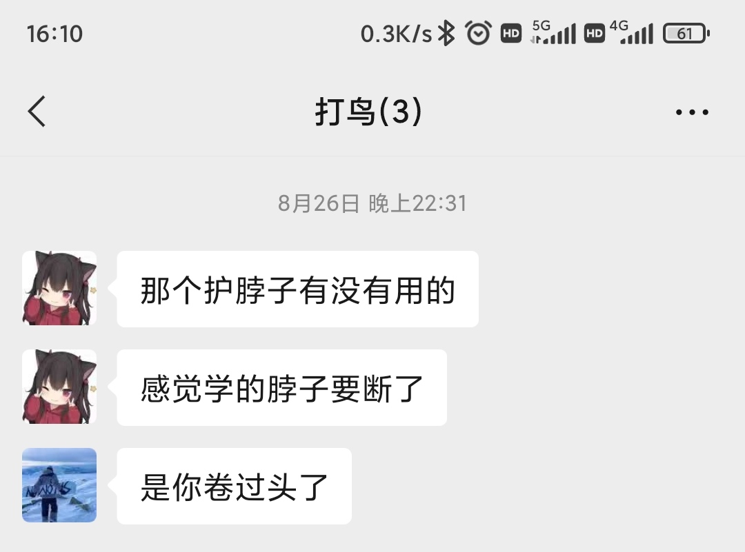 23:06,我决定还是发几句吧,不然显得我一直在潜水,看了消息都不冒泡。我直接挑明了问她:“为什么要回去卷,自习室不好么?”然后又说:“这几天你都是偷偷地跑了,都不等我们。”其实我只是矫揉造作地发几句而已,根本就不在乎这些问题。但是我却很想知道她到底会怎样回复这些问题。自从她回宿舍以后,DLY也不学了,只是坐在位置上看视频。原来,DLY在她面前也在装,装得很努力的样子,她不在之后就放松了。