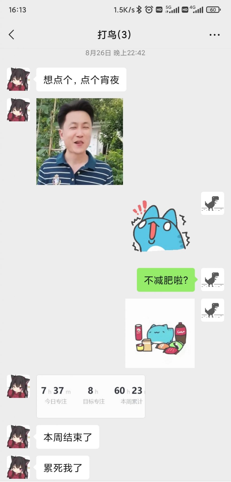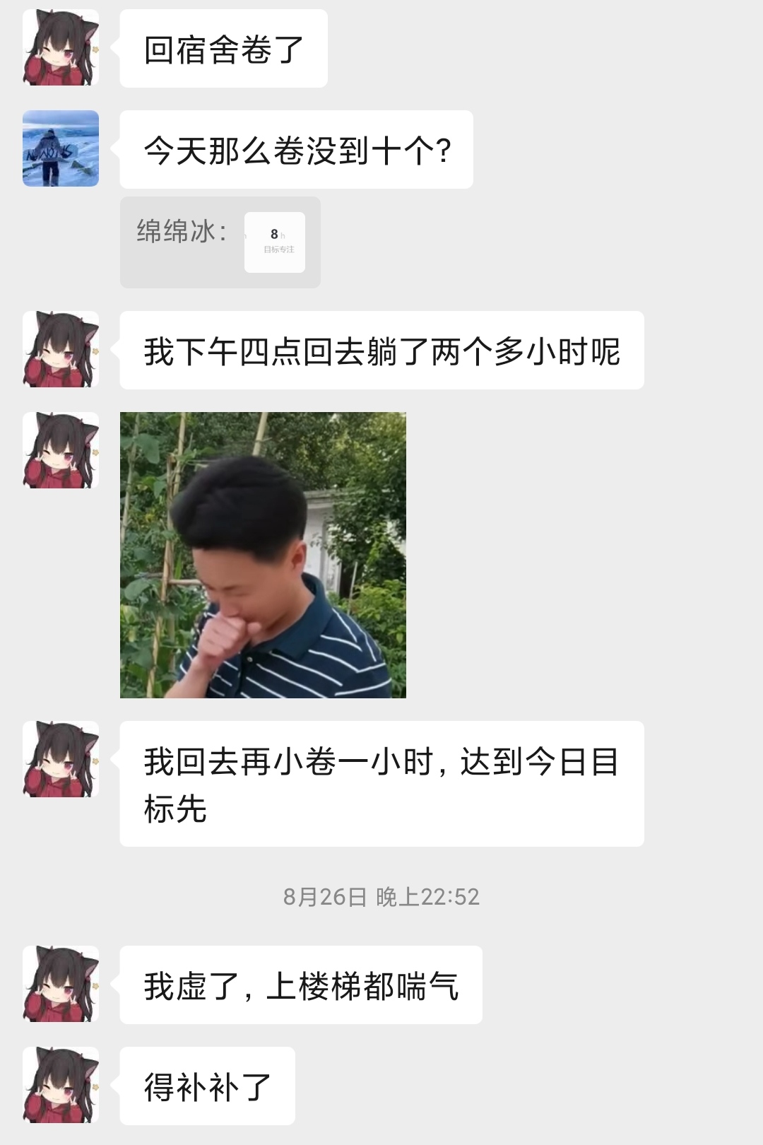 22:42,十分钟过去,她终于忍不住了,在群里说:“想点个,点个宵夜”。我知道她是想叫我和DLY一起点宵夜,然后在自习室里一边吃一边聊天,但是我不想,估计DLY也不想。我直接挑明了说:“不减肥啦?”DLY没有说话,她也没有再回复。过了一会,她居然直接跳过了宵夜的话题,在群里发了一张今天学习计时的截图,说回宿舍卷了。DLY调侃她说:“今天怎么没学够十个小时?”她此时已经收拾了东西,走出了自习室。她说:“回去再小卷一小时,达到今日目标先。”估计是回到宿舍门口了,然后又说:“我虚了,上楼梯都喘气,得补补了。”DLY很快就看到她发的消息了,我看到他已经在聊天窗口打着字了,然后他听见我敲键盘的声音,就停下来了,然后把打的字全删了。我知道他是故意不回复了,想让我在群里说话回复她。但其实我根本就没有在打字回复她,我也不想回复。